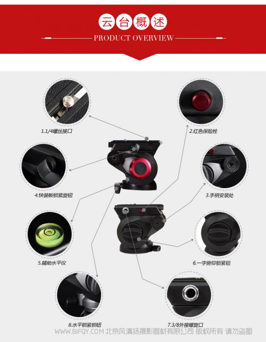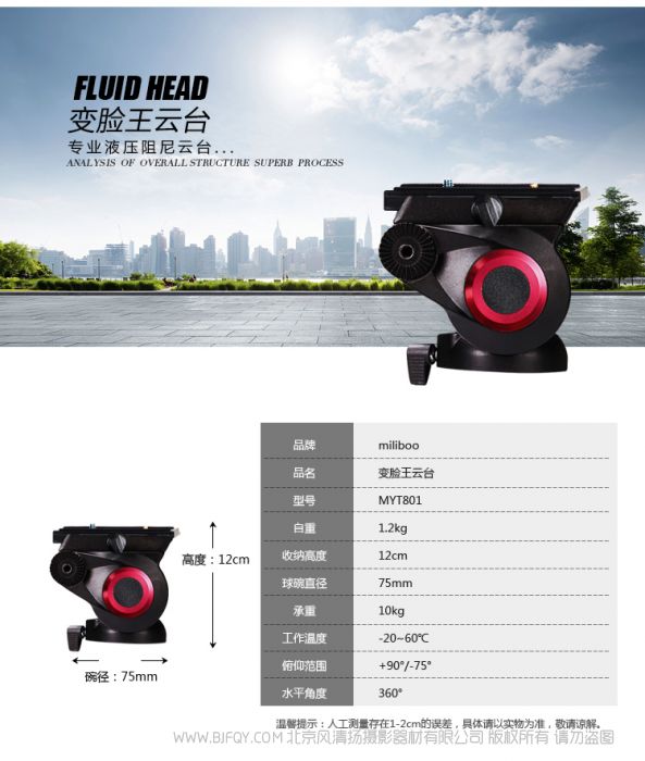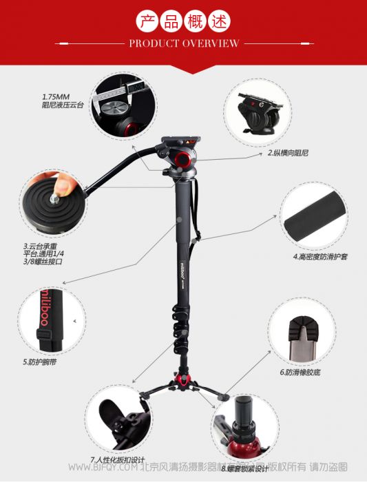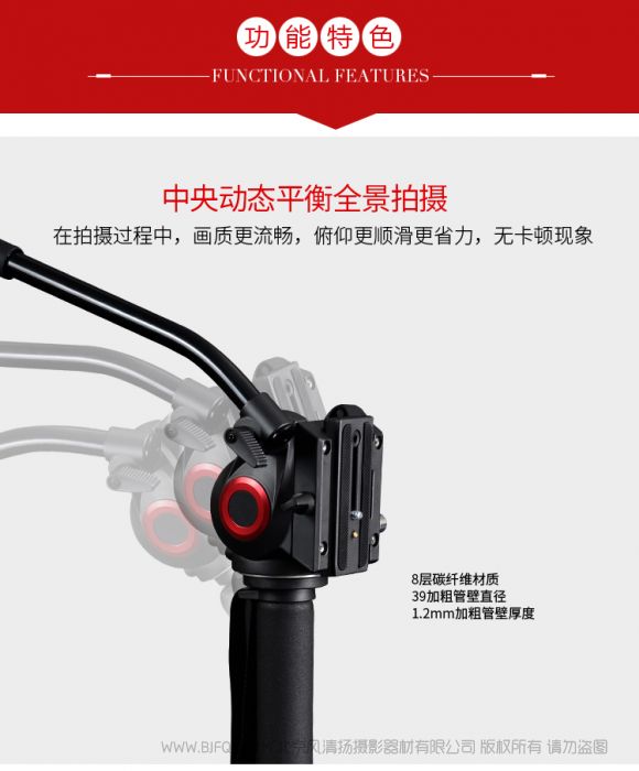 独脚架采用75mm碗径液压云台,可以捕捉更清晰画质,提供了更顺滑的的操作体验。同时脚架采用轻便的碳纤维材质脚管,重量仅2.01kg,较大管径达到34.2mm,壁厚1.2mm,比传统管径及壁厚提升25%,承重可达15kg,追求铁塔般稳定。脚架较高工作高度可达184.5cm,满足不同的拍摄需求。