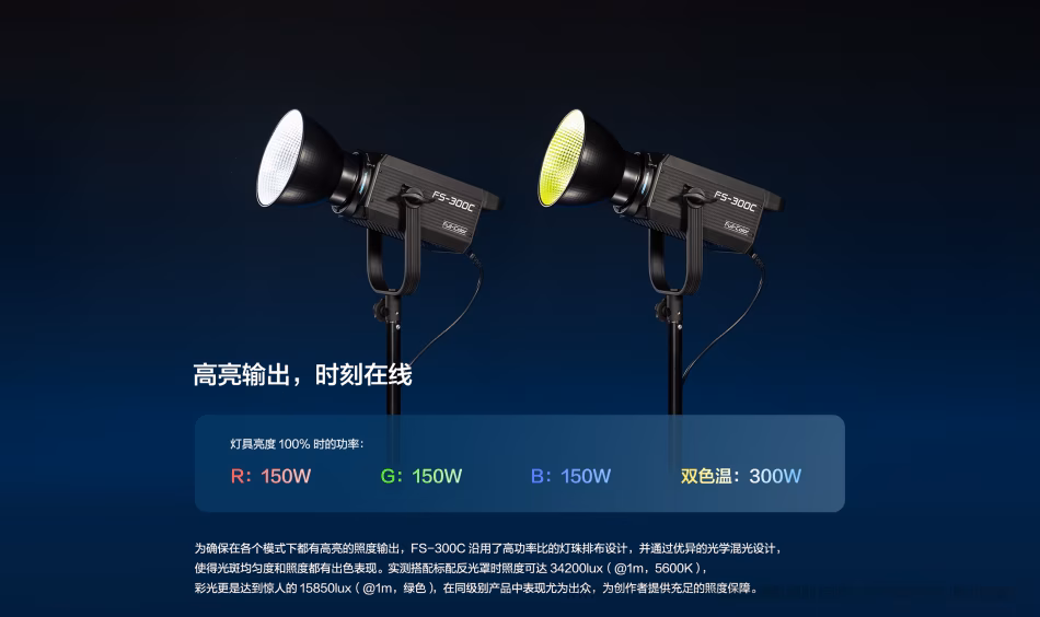 为确保在各个模式下都有高亮的照度输出,FS-300C沿用了高功率比的灯珠排布设计,并通过优异的光学混光设计,
