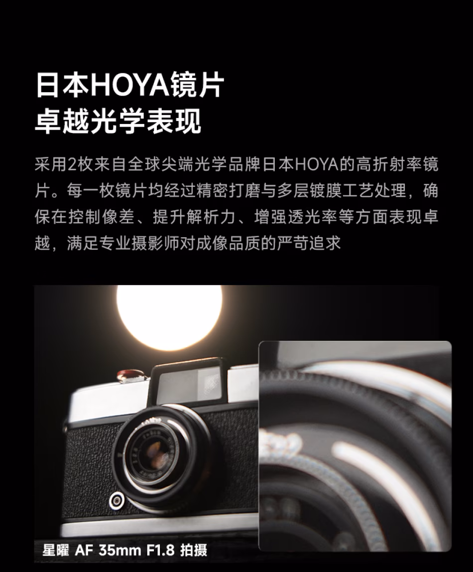 采用2枚来自全球尖端光学品牌日本HOYA的高折射率镜片。每一枚镜片均经过精密打磨与多层镀膜工艺处理,确保在控制像差、提升解析力、增强透光率等方面表现卓越,满足专业摄影师对成像品质的严苛追求