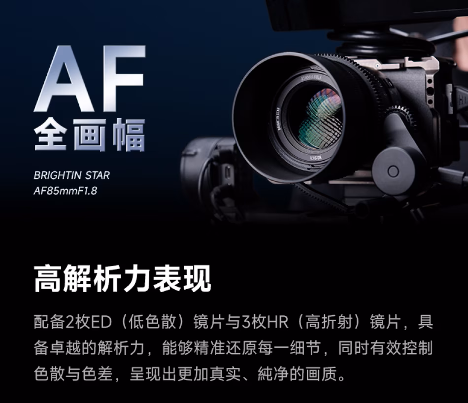 AF全画幅BRIGHTIN STARAF85mmF1.8高解析力表现配备2枚ED(低色散)镜片与3枚HR(高折射)镜片,具备卓越的解析力,能够精准还原每一细节,同时有效控制色散与色差,呈现出更加真实、纯净的画质。