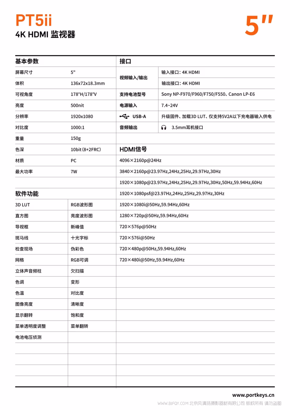 PortKeys 门钥匙 艾肯 PT5 II 5” 4K HDMI 30P 专业级监视器