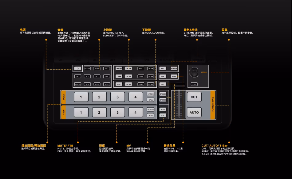 * T-bar/AUTO/CUT切换;多种特效:WIPE/ MIX/ DIP