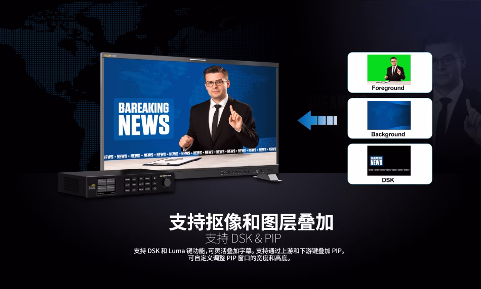 * 3 路 4K HDMI 输入:支持前景、背景及下游键、信号输入
