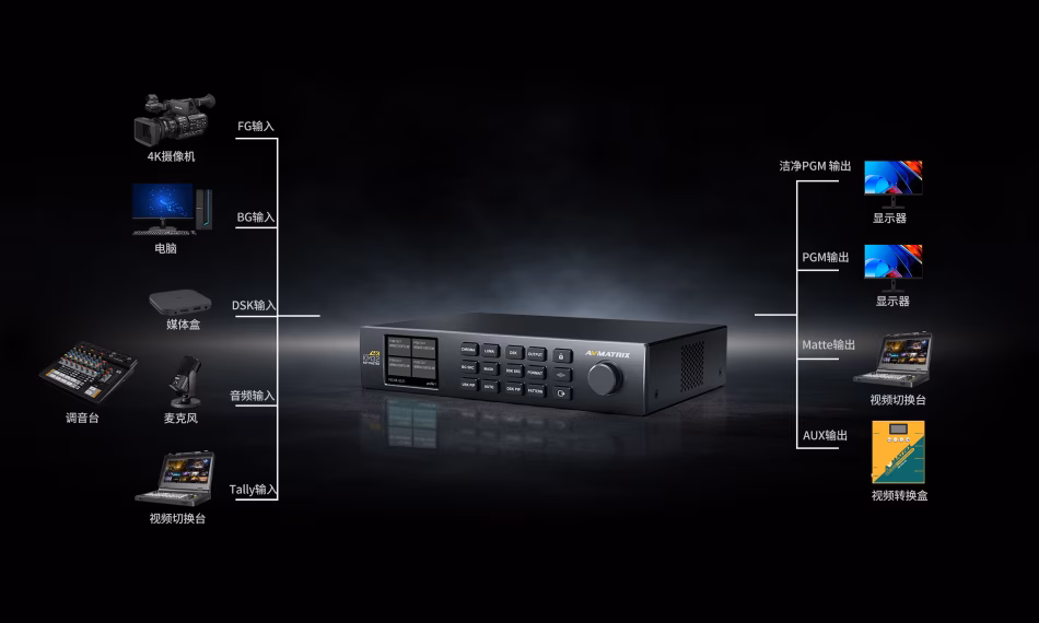 * 4 路 4K HDMI 输出:PGM、Clean PGM、Matte、AUX 灵活输出