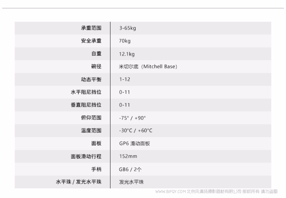 此外,它还设计有俯仰安全锁定和面板安全释放装置,以确保相机安全。相机快装面板的两侧有刻度,并具有152mm的滑动行程。内置照明水平仪可帮助在黑暗中进行平衡,并配备了可伸缩的双手柄。