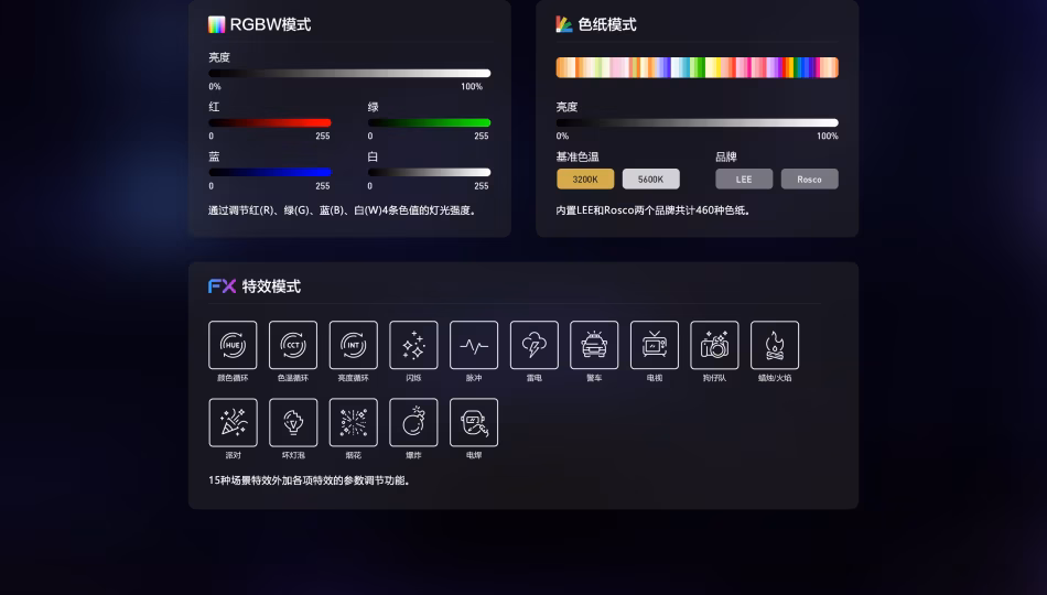 场景特效 | 颜色循环,色温循环,亮度循环,闪烁,脉冲,雷电,警车,电视,狗仔队, |