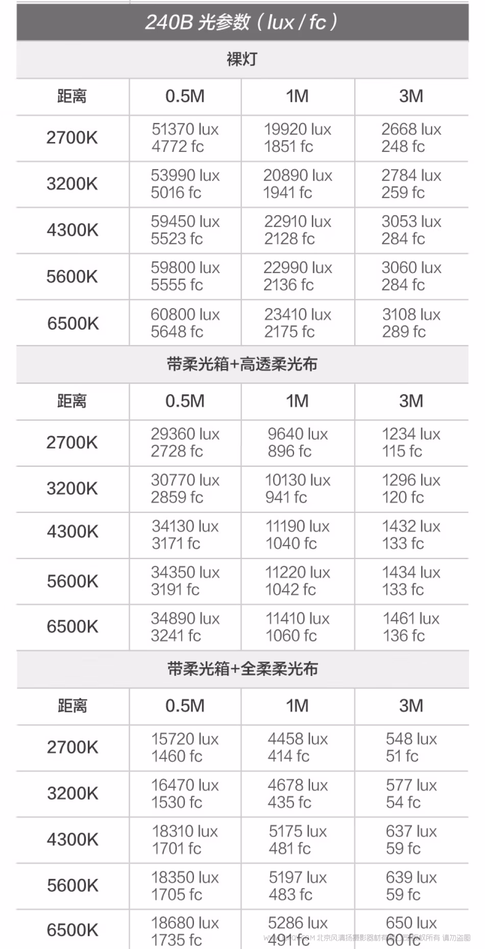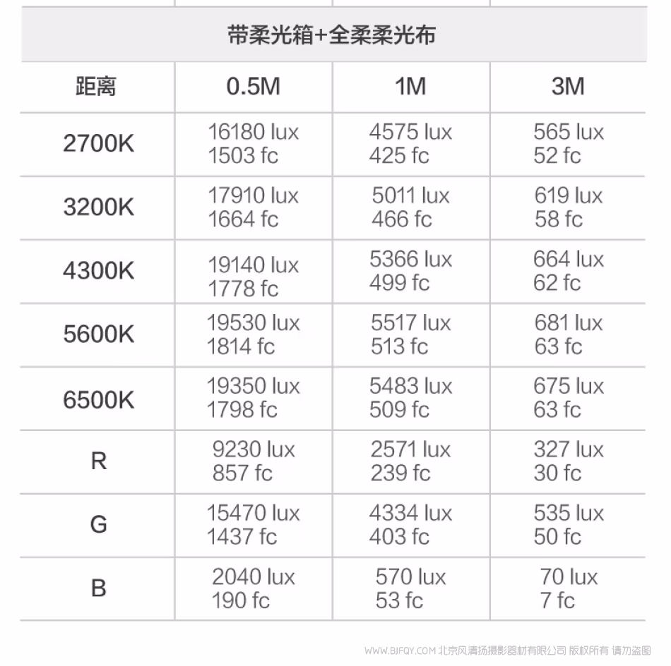 | 5600K | 59900 lux / 5555 fc | 22990 lux / 2136 fc | 3060 lux / 284 fc |