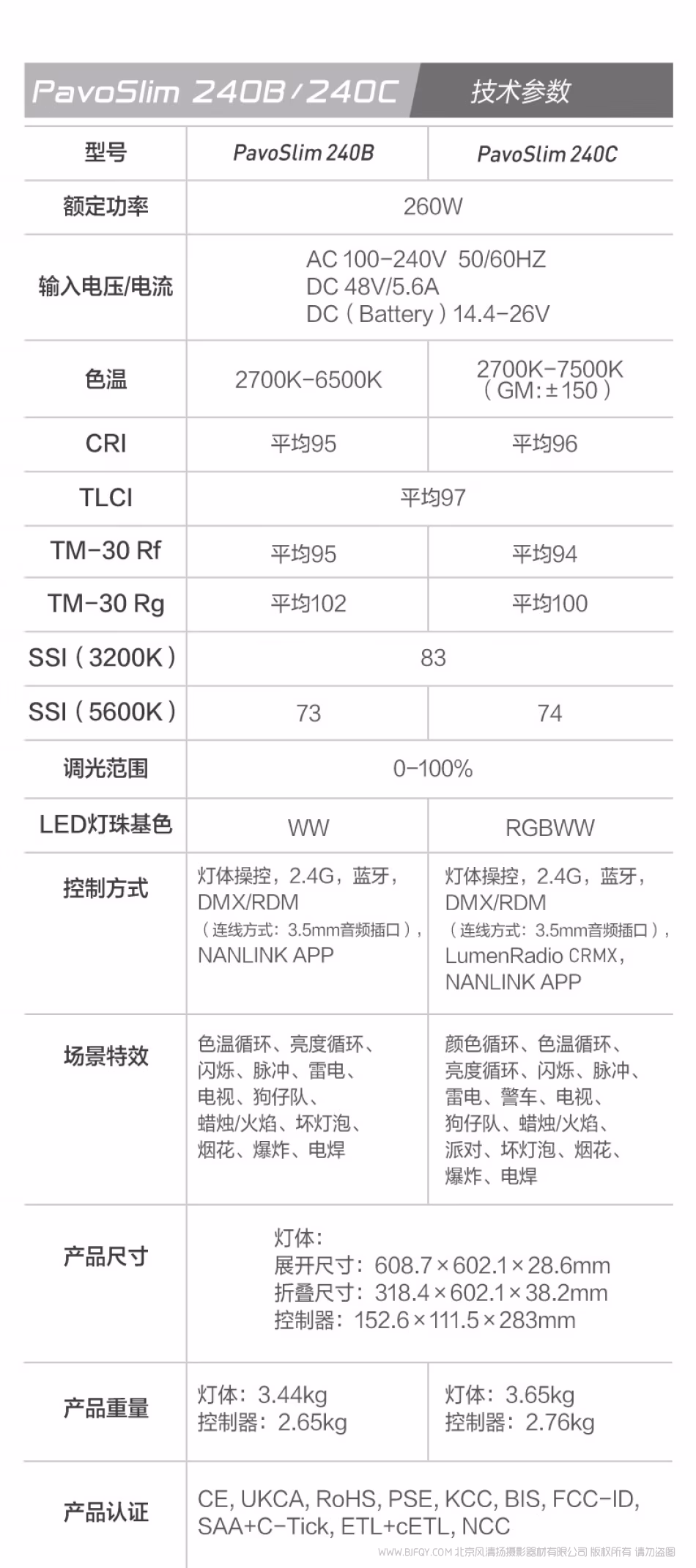 | 场景特效 | 色温循环、亮度循环、闪烁、脉冲、雷电、电视、 狗仔队、蜡烛/火焰、坏灯泡、烟花、爆炸、电焊 | 颜色循环、色温循环、亮度循环、闪烁、脉冲、 雷电、警车、电视、狗仔队、蜡烛/火焰、派对、 坏灯泡、烟花、爆炸、电焊 |