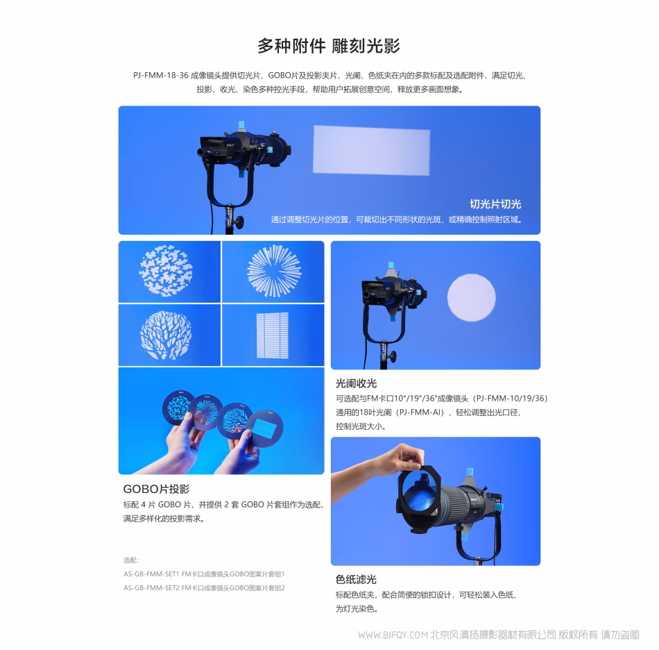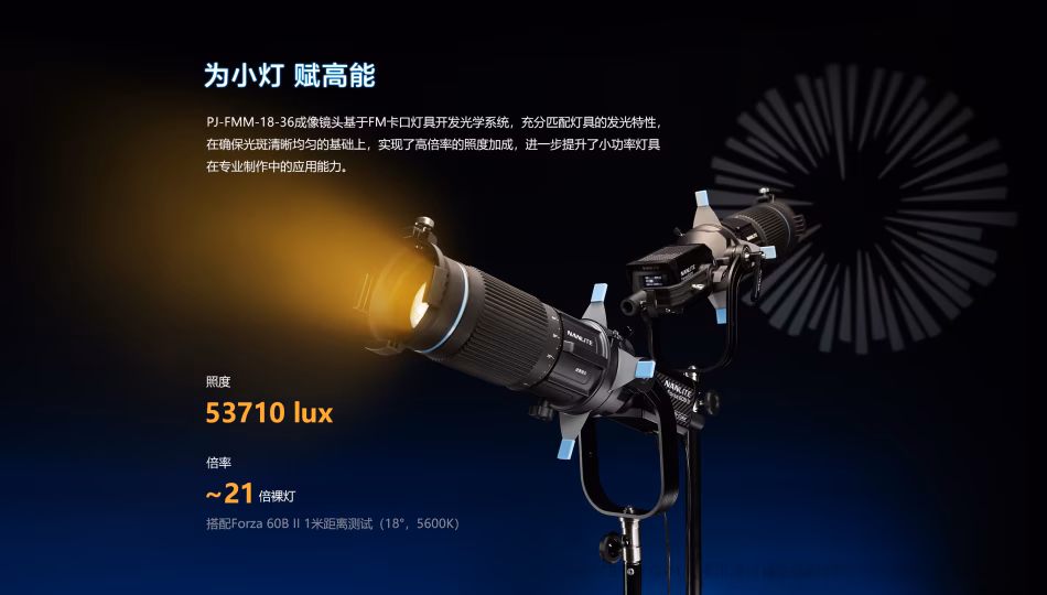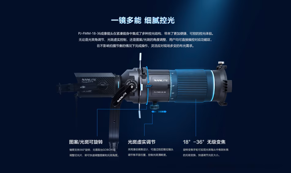 为此,Nanlite南光推出专为FM卡口灯具设计的变焦成像镜头(PJ-FMM-18-36),