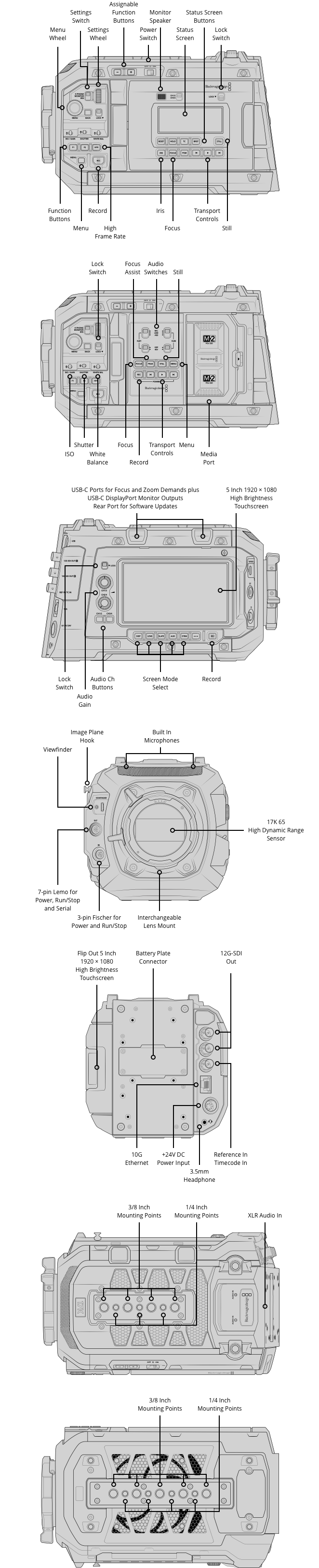 5英寸屏幕上配备触摸屏菜单。实体按钮可实现其他控制。7个可指派快捷按钮,以及选配URSA Cine EVF上的6个可指派寻像器快捷按钮。