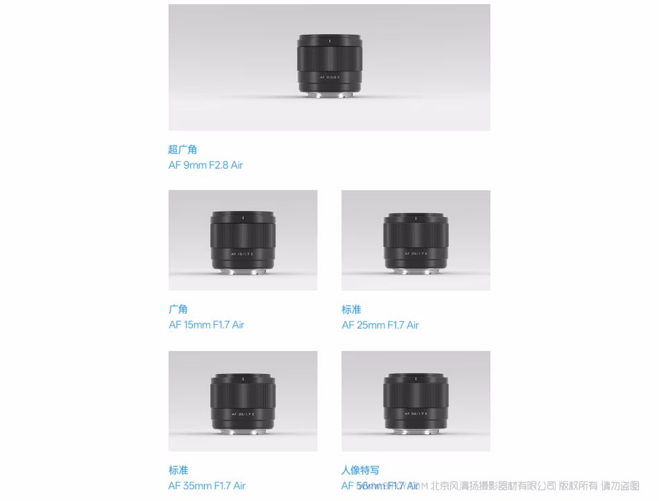 | 名称 | AF 15/1.7 Air E/Z/XF | AF 25/1.7 Air E/Z/XF | AF 35/1.7 Air E/Z/XF | AF 56/1.7 Air E/Z/XF | AF 9/2.8 Air E/Z/XF |