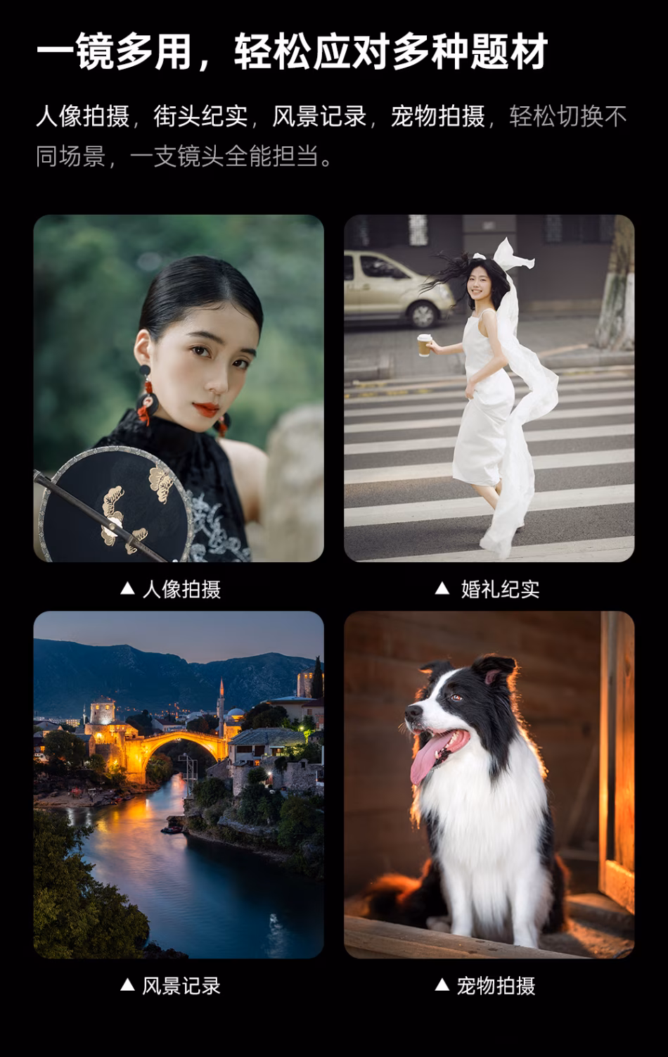 一镜多用,轻松应对多种题材 人像拍摄, 宠物拍摄,轻松切换不 街头纪实,风景记录, 同场景,一支镜头全能担当。