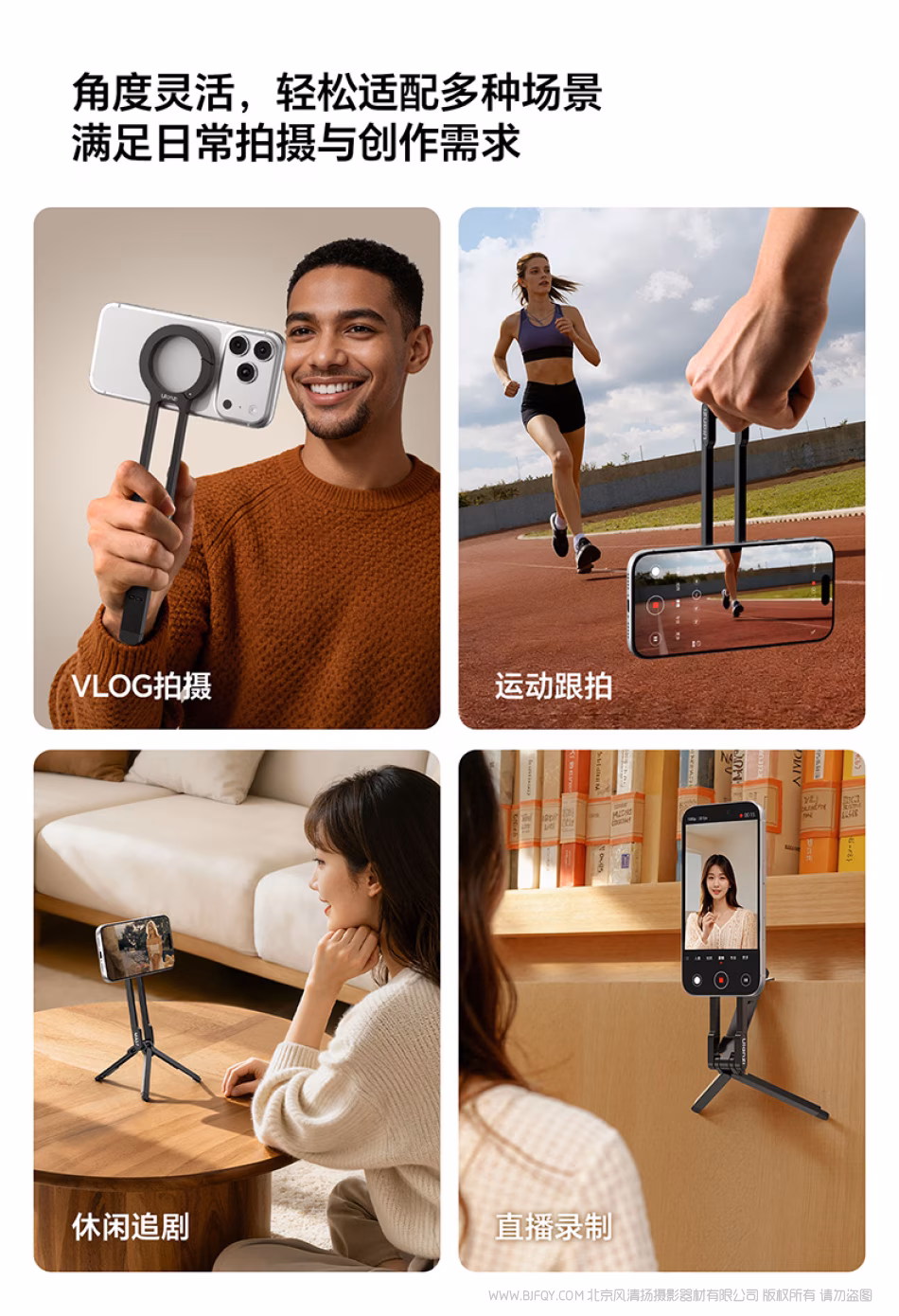 角度灵活,轻松适配多种场景 满足日常拍摄与创作需求 VLOG拍摄 运动跟拍 休闲追剧 直播录制
