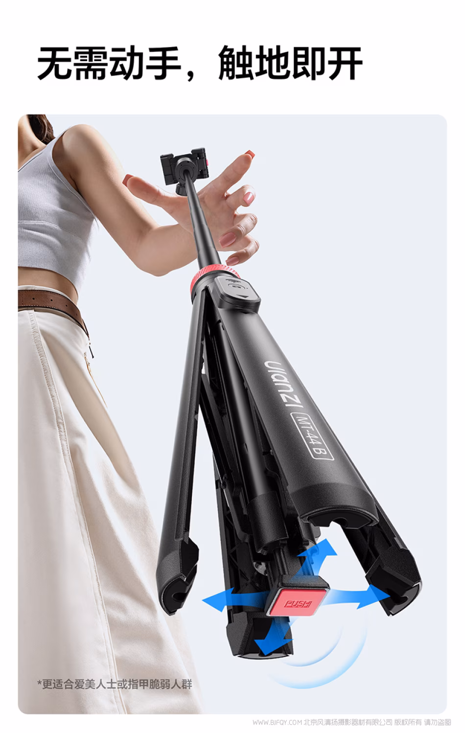 注意:支架在完全延伸状态下,受力与稳定性会随负载增加发生变化 为确保拍摄稳定性与使用安全,建议搭配轻量化拍摄设备使用。