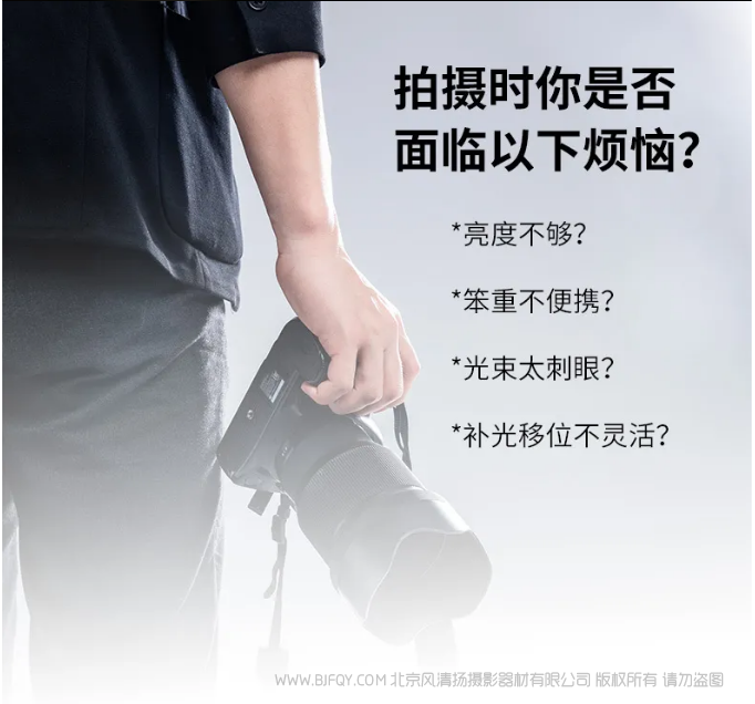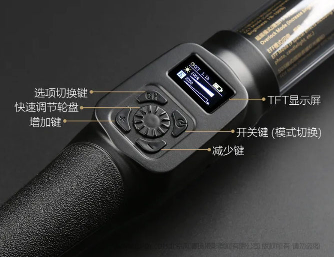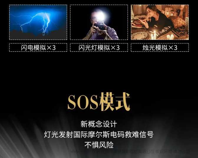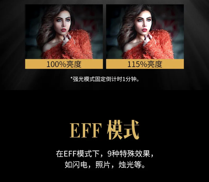 | 基本功能 | 亮度调节、色温调节、若干特效、闪电及SOS模式、较大功率连续输出约100分钟 |