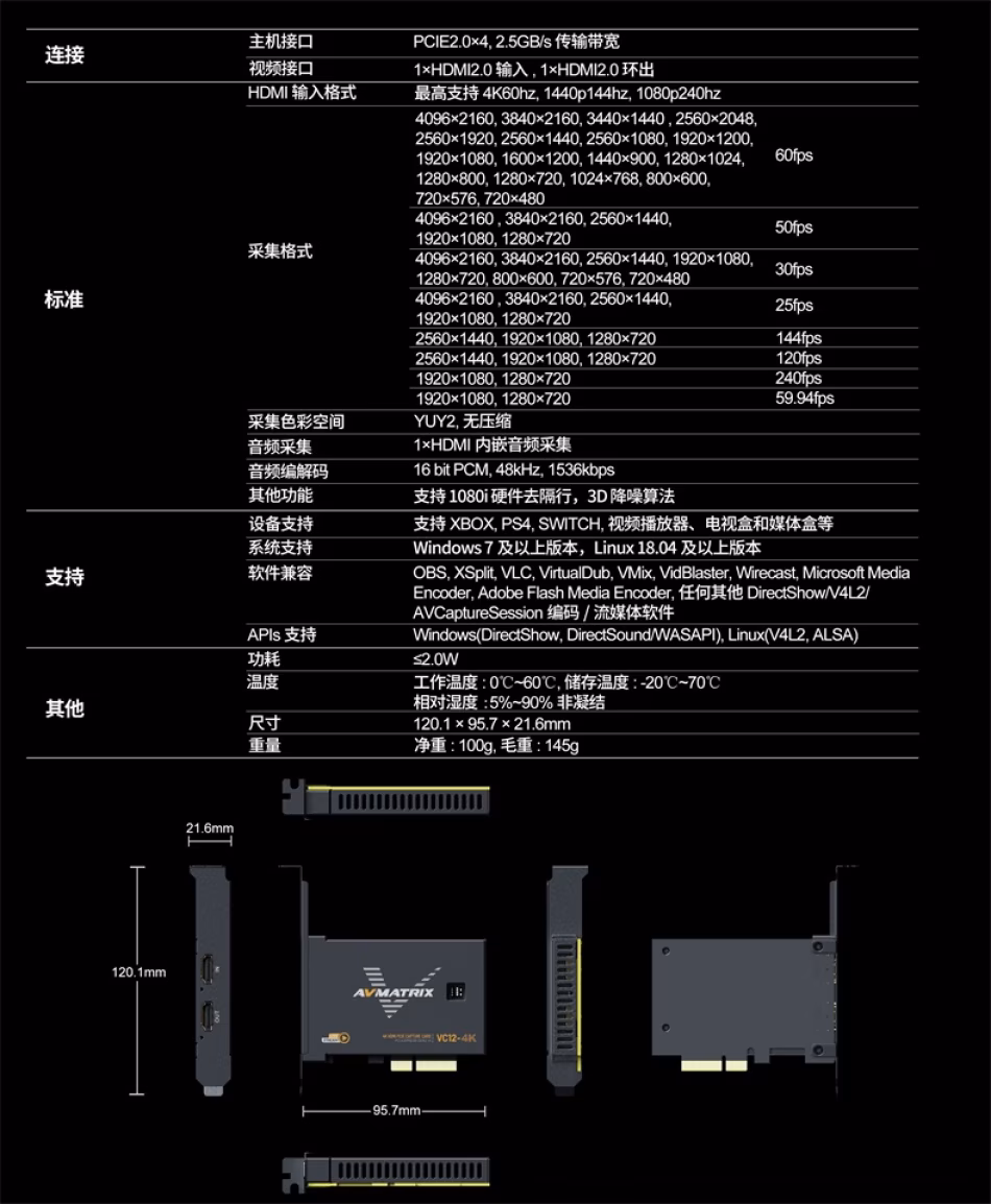 | 采集格式 | 4096x2160,3840x2160,3440x1440,2560x2048, 2560x1920,2560x1440,2560x1080,1920x1200, 1920x1080,1600x1200,1440x900,1280x1024, 60fps 1280x800, 1280x720, 1024x768,800x600, 720x576,720x480