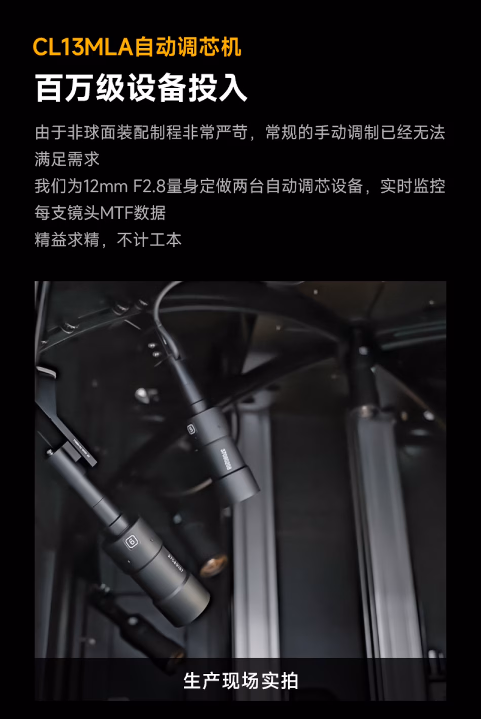 2枚高精度非球面制作难度可以用苛刻来形容,一片为月牙形状,直径较大且曲面角度接近100°;一片则采用反曲面蝴蝶型设计,镜片形变控制难度非常高生产过程中精度控制达到μ级,制程良率比普通镜片低一