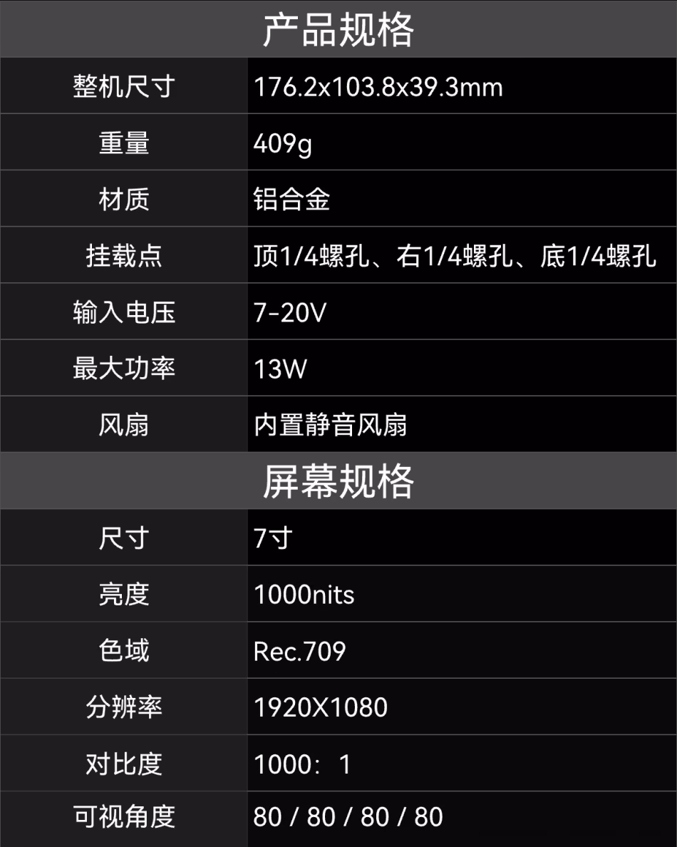 | HDMI OUT | 1920x1080p@60Hz 3D LUT 输出 UI输出 图像亮度、色调、对比度调整输出 竖拍拉大长腿输出 |