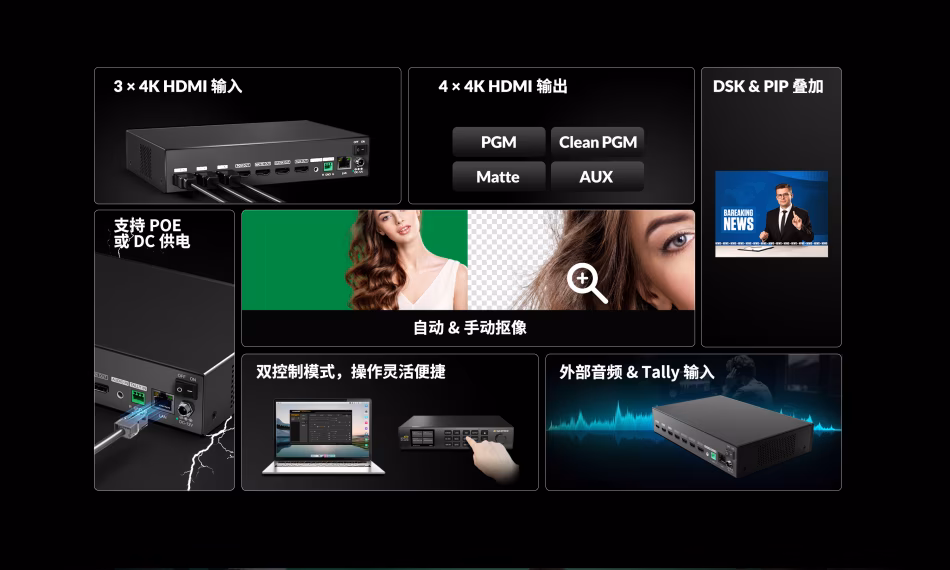 * 4 路 4K HDMI 输出:PGM、Clean PGM、Matte、AUX 灵活输出