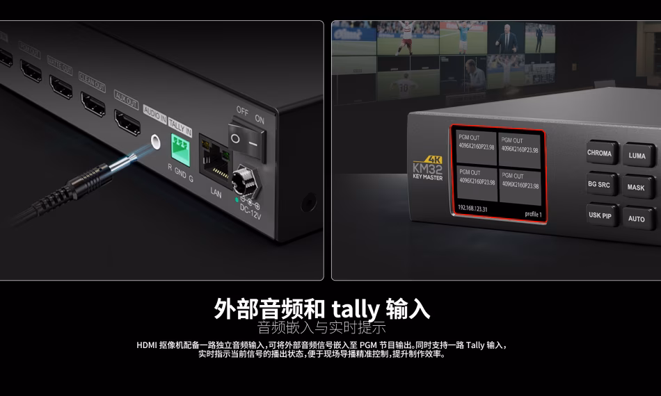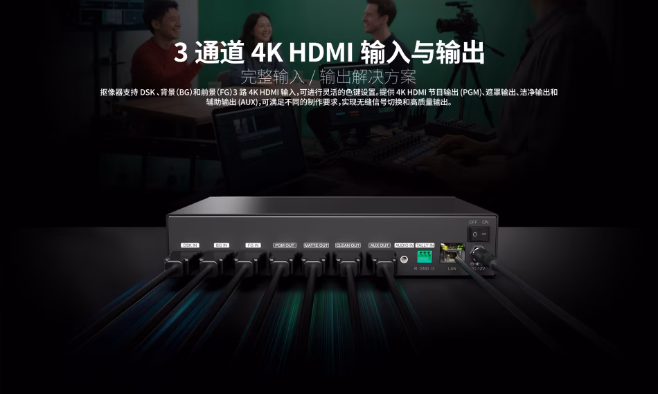 * 3 路 4K HDMI 输入:支持前景、背景及下游键、信号输入