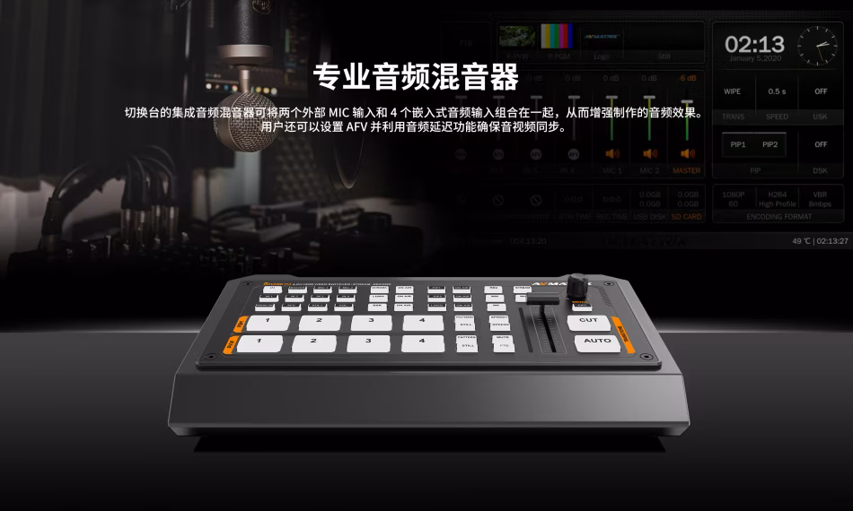 *音频混合,支持4路HDMI嵌入式音频和2路MIC输入,支持音频延迟,AFV功能