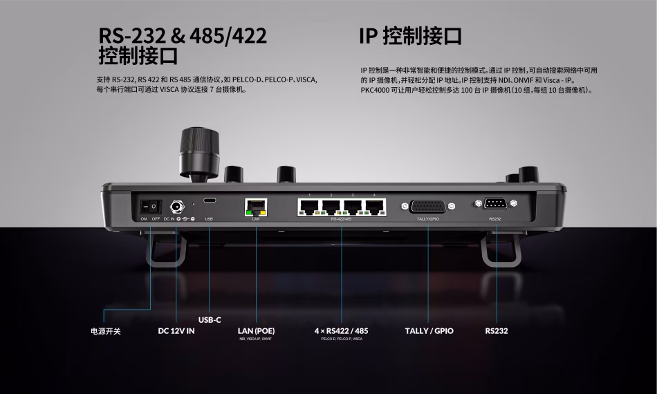 | 连接 | 接口 | IP(RJ45)x1,RS-232x1,RS-485/RS422x1,TALLYx1,USB2.0(用于升级) | |