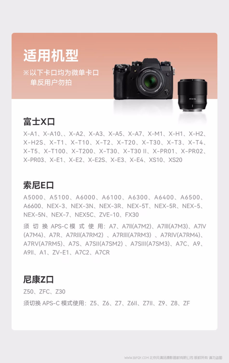 富士X口 | X-A1、X-A10、X-A2、X-A3、X-A5、X-A7;X-M1;X-H1、X-H2、X-H2S;X-T1、X-T10、X-T100、X-T2、X-T20、X-T200、X-T3、X-T30、X-T30II、X-T4、X-T5;X-Pro1、X-Pro2、X-Pro3;X-E1、X-E2、X-E2S、X-E3、X-E4;X-S10、X-S20 ,etc. | |