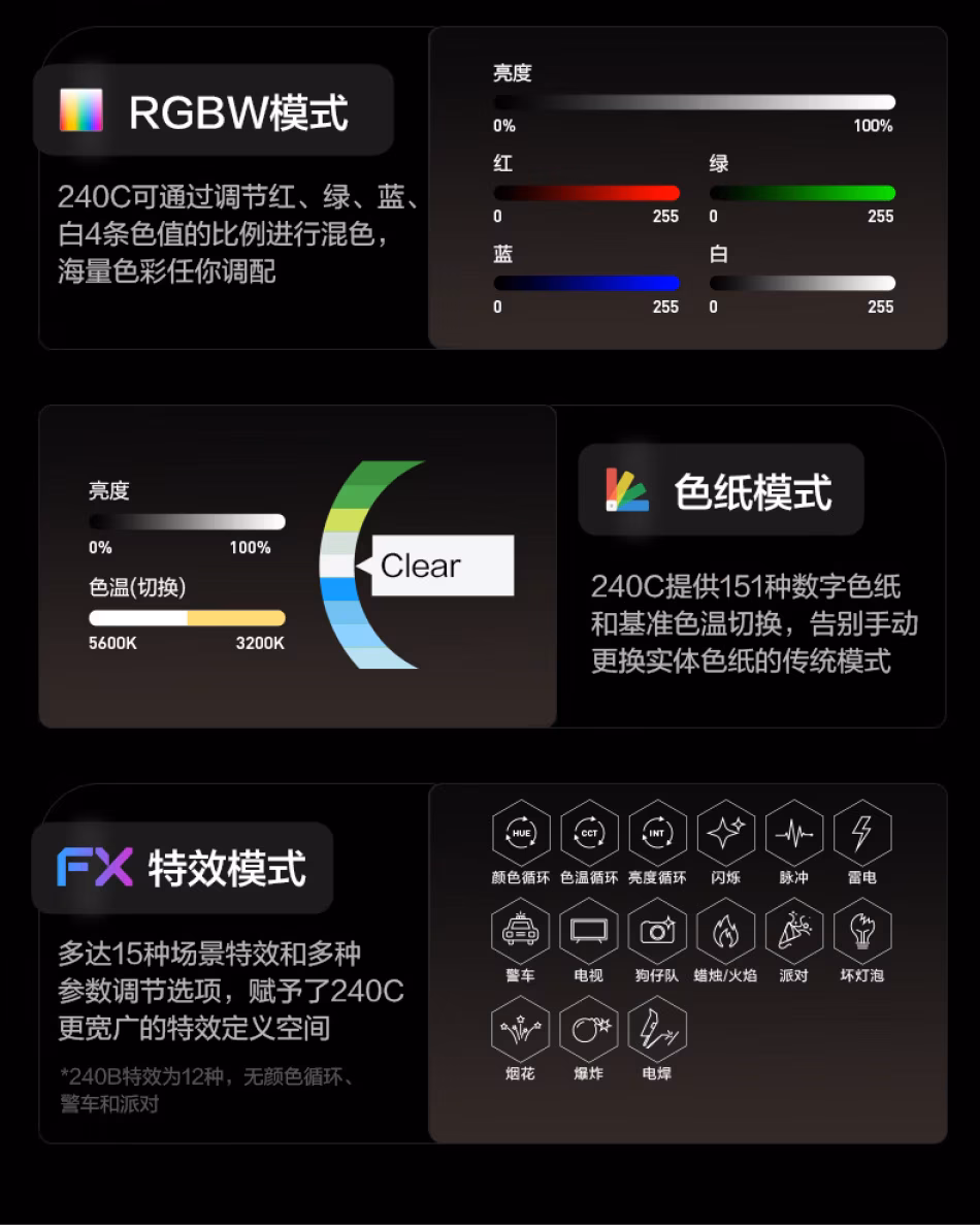 | 场景特效 | 色温循环、亮度循环、闪烁、脉冲、雷电、电视、 狗仔队、蜡烛/火焰、坏灯泡、烟花、爆炸、电焊 | 颜色循环、色温循环、亮度循环、闪烁、脉冲、 雷电、警车、电视、狗仔队、蜡烛/火焰、派对、 坏灯泡、烟花、爆炸、电焊 |