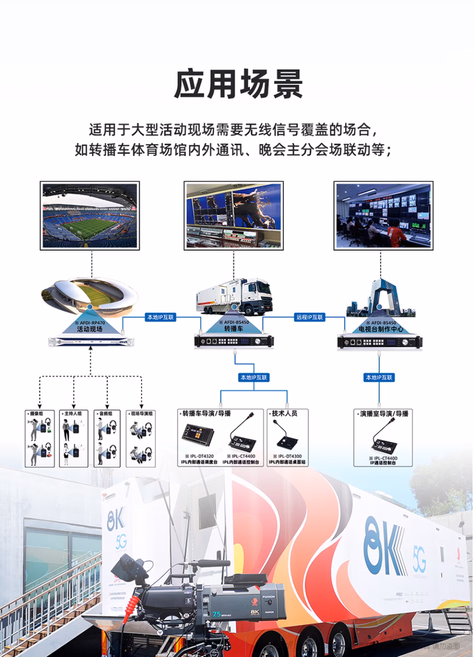 适用于大型活动现场需要无线信号覆盖的场合 如转播车体育场馆内外通讯、晚会主分会场联动等: