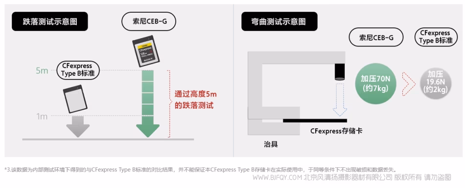 *4. 该数据为内部测试环境下得到的与CFexpress Type B标准的对比结果,并不能保证本CFexpress Type B存储卡在实际使用中,千同等条件下不出现破损和数据丢失。