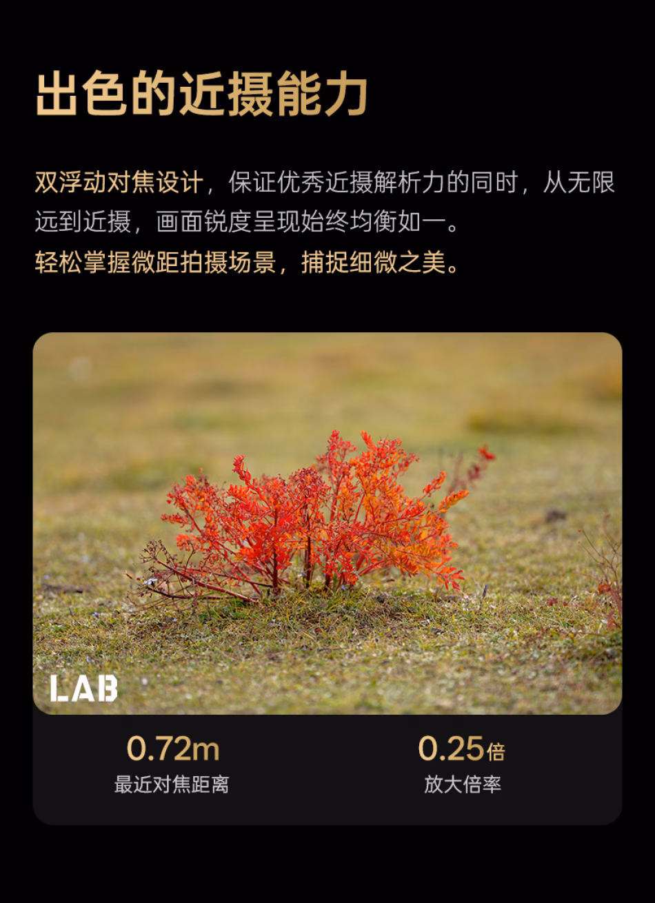 双浮动对焦设计,保证优秀近摄解析力的同时,从无限