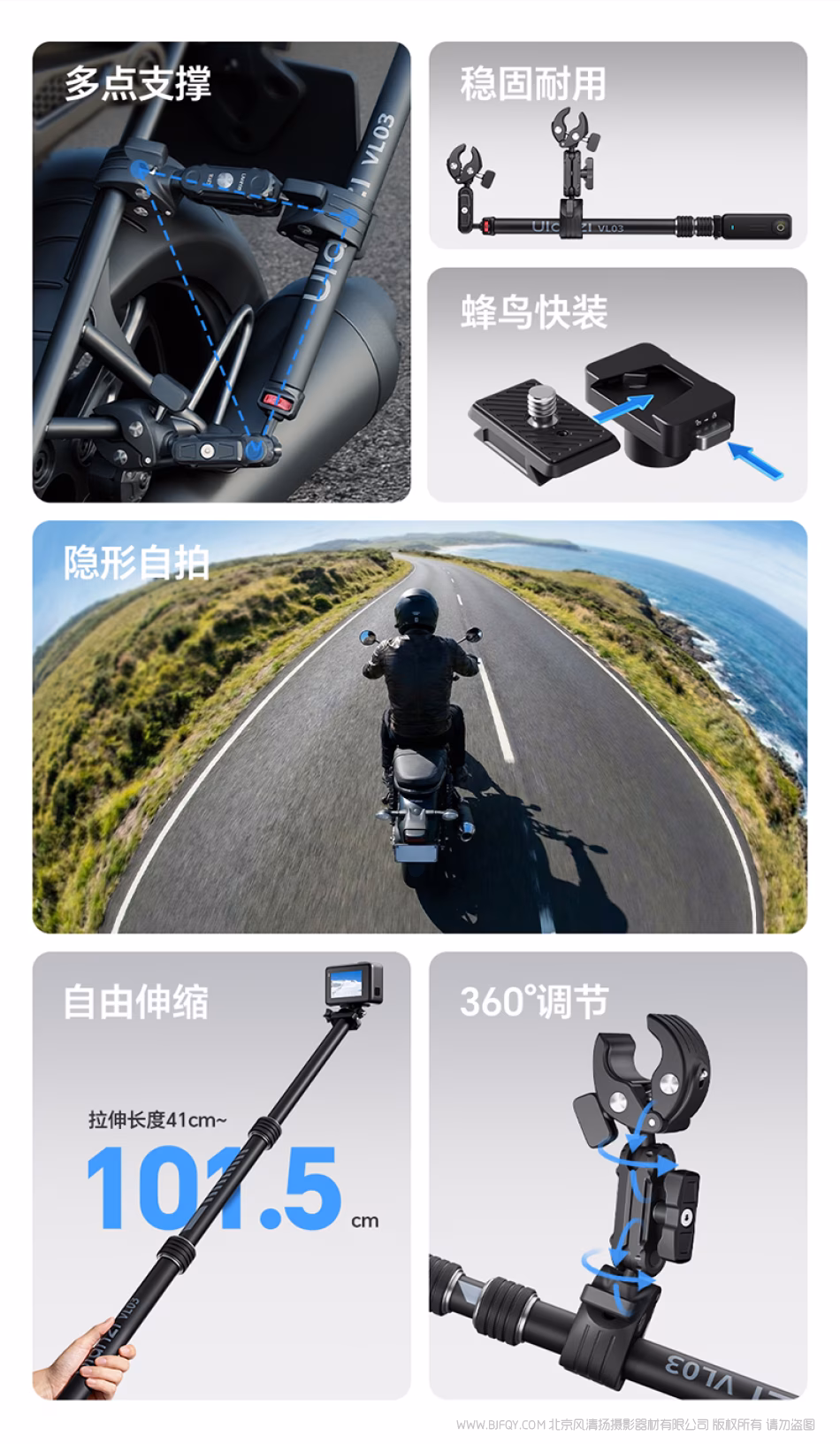 优篮子 Ulanzi VL03 摩托车隐形自拍杆支架 自由骑行 稳拍随行