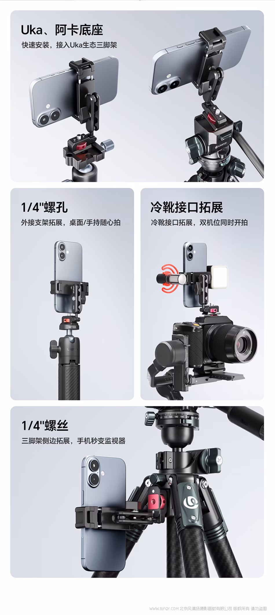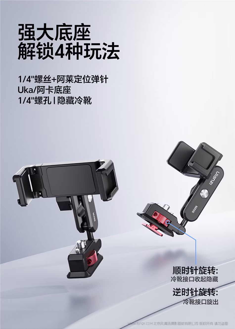 Uka、阿卡底座 快速安装,接入Uka生态三脚架 1/4"螺子孔 外接支架拓展,桌面/手持随心拍 冷靴接口拓展 冷靴接口拓展,双机位同时开拍 1/4"螺丝 三脚架侧边拓展,手机秒变监视器