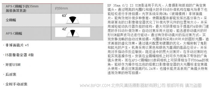 EF 35mm f/2 IS USM是适用于风光、人像摄影和抓拍的广角定焦镜头。通过明亮的光圈F2和强大的手抖动补偿机构在暗光场景下也能轻松进行手持拍摄。光学系统采用GMo(玻璃模铸)非球面镜片,能有效地补偿多种像差,使画面整体都能发挥出高分辨力。采用新算法的IS影像稳定器优化了补偿光学元件的位置和大小,并采用减轻驱动执行器负担的结构,较大可获得相当于提高约4级快门速度的手抖动补偿效果。自动对焦采用大扭矩、能迅速移动镜片的环形USM超声波马达进行驱动。通过有效移动镜片的后对焦方式,实现安静流畅的自动对焦拍摄。光圈结构采用8片叶片的圆形光圈,追求美丽的虚化效果。通过镜片配置和镀膜的优化,大幅抑制了鬼影和眩光的产生。机身采用以黑色和银色为基调的高品位设计,并采用对手指动作反应敏锐,阻尼适中的宽大对焦环,在手动对焦时也能实现高操作性。安装在全画幅相机上时可作为视角不夸张的广角镜头使用,而在APS-C画幅EOS数码相机上可获得相当于约56mm的视角,能够作为操作性出色的搭载IS影像稳定器的大光圈标准定焦镜头使用。较近对焦距离约0.24米,也擅长能灵活表现广角镜头特有透视效果的特写拍摄。